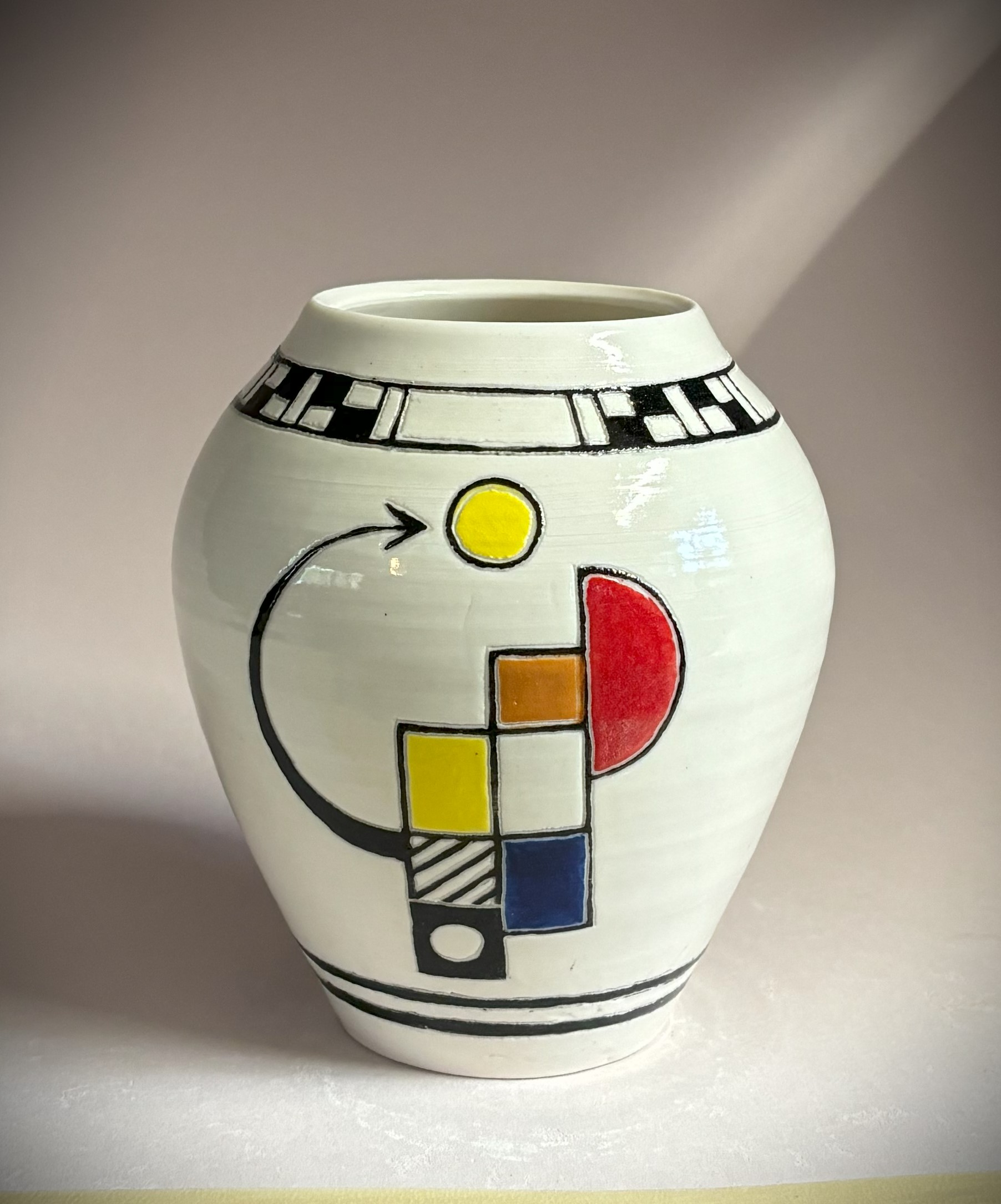 I am continuing to explore this color combination, now with added raven designs. The tallest one shown here is 8″. The yellow under glaze does not like to be painted over the black, as it crinkles the surface, but the reverse is not a problem. I am please with this progress and encouraging result.