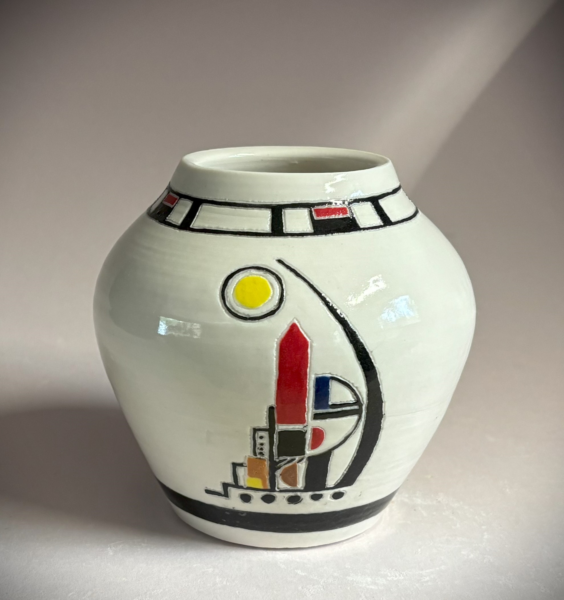It has been more that a year since I have done any ceramic work. Now, I am back in the studio working on a “fine” art type of porcelain vase. The one on the left is greenware. I use Mayo UG-50 jet black underglaze applied to the leather hard vase and, just as soon as the underglaze dries (two coats needed), I use an etching stylus to outline the figures or do scrafitto designs on the top and bottom black bands. The green ware is then dried and fired straight to cone 6; no bisque stage involved. The outside is not glazed but there is a clear glaze inside. The outside is then lightly finished using 220 grit wet-to-dry sandpaper. The porcelain is Kota cone 5-6 (Kentucky Mudworks).
