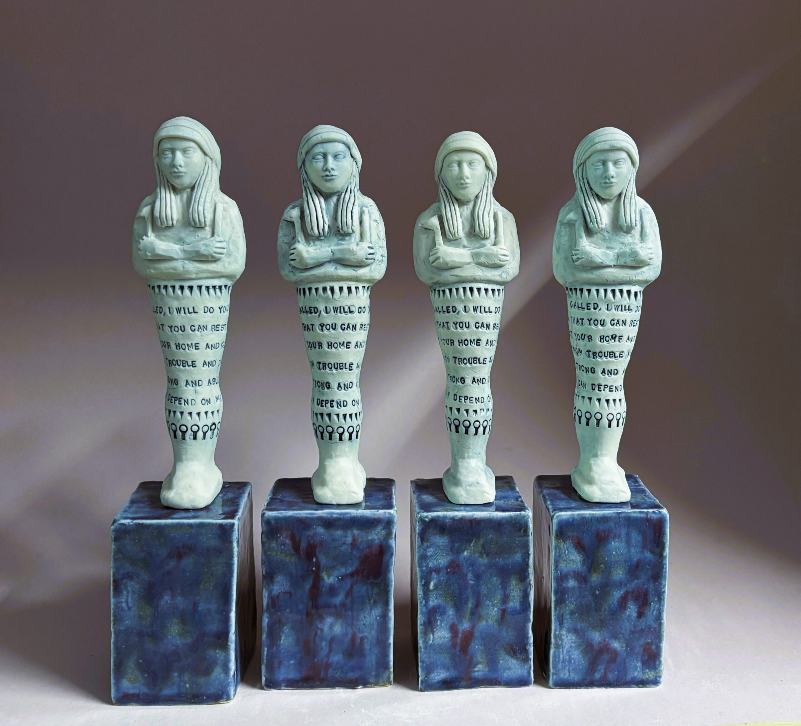 Illustrated are a group of my most recent “blue” Shawabtis which are the newest of an ongoing series made during the last 15 years. The series addresses my belief that people in the present world need help with their everyday troubles. This help might be solicited through use of ancient Egyptian style sculptures that beckon help from the afterworld. A request for protection and assistance is printed (in english text) around the body of each figure. Each Shawabti is made from porcelain, and the bases are either marble or clay; materials unchanged for millions of years until now transformed.